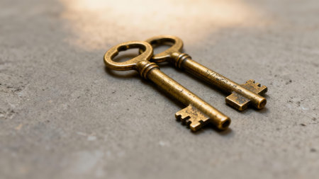 Close up of two ornate golden-colored master keys lying parallel on a gritty concrete slab, highlighted by directional sunlight from above, featuring shallow depth of field.