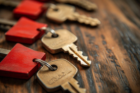 A vibrant assortment of keys on a sleek wooden surface, emphasizing organization and security in everyday life. Perfect for themes of security and efficiency.