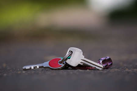 Door key lies on pink background. Set of keys. Bunch of keys. House key. New house concept. Rental and Selling.
