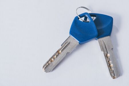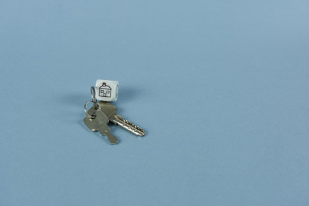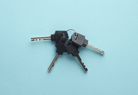 Door key lies on blue background. Set of keys. House key. New house concept. Rental and Selling.