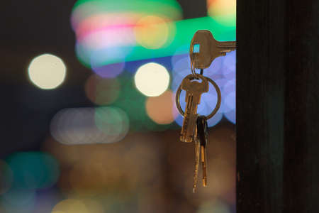 The keys with keyring in the door keyhole with blurred night lights background, selective focus