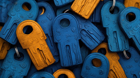 A vibrant collection of blue and orange key tags arranged closely together, perfect for organizational needs. This image showcases texture and color for identification purposes.