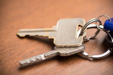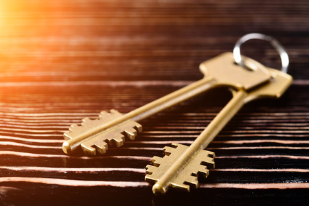 A bunch of different keys lies on a wooden table, illuminated by light. The keys to the front door to the apartment. Sale of real estate.