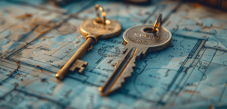 Two keys resting on a blueprint surrounded by a water landscape, wood table, and metal fashion accessories. A circle event for recreation and jewelry design