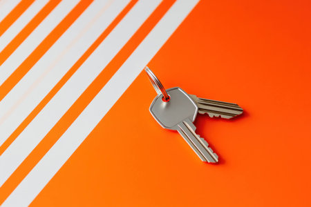 Close up of modern metallic keys on a vibrant orange background with white stripes, suggesting security and access to new opportunities