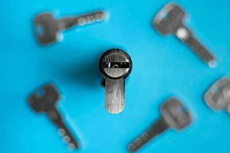 A door lock cylinder core with keys on the blue background. The cylinder of the lock with keys. Installing a new lock on the door. Spare parts for the door.