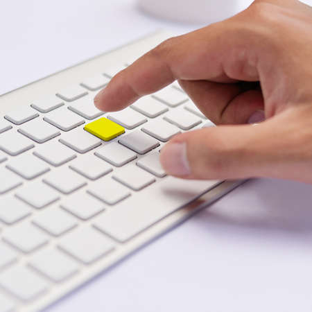 Finger pressing the enter key on a computer, macro photo.