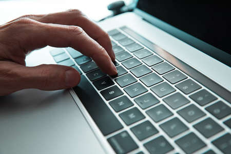 Male hand typing on laptop keyboard. Man work at home office, open notebook, close up view, selective focus.