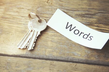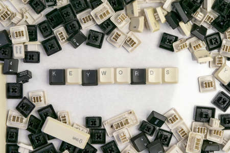keying works on microstocks, the word keywords folded from the keys of the old keyboard, surrounded by randomly scattered keys