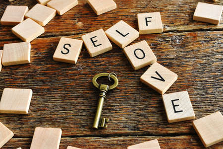 A close up image of wooden alphabet blocks spelling out the inspirational message of self love.