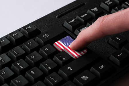 Pressing enter button with USA flag, represents a cyber-attack of America, metaphor of learning English language, black keyboard close up