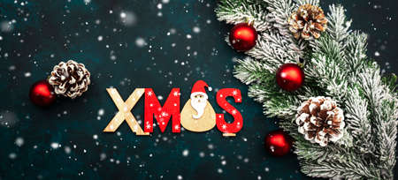 Blue Christmas or New Year background with red Christmas balls, berries, fir branches, pine cones with an inscription Xmas and snowflakes, top view