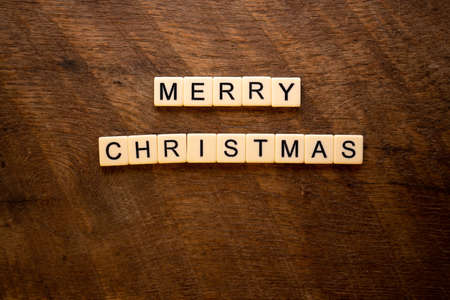Merry Christmas lettering in plastic letters on an old vintage letter board. Top view. Flatley. Christmas greeting card.