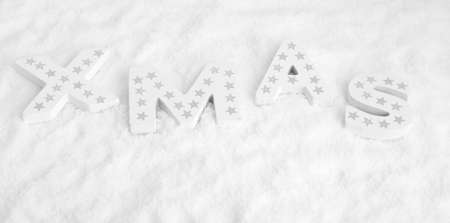 White wooden letters in snow form the word XMAS with silver stars