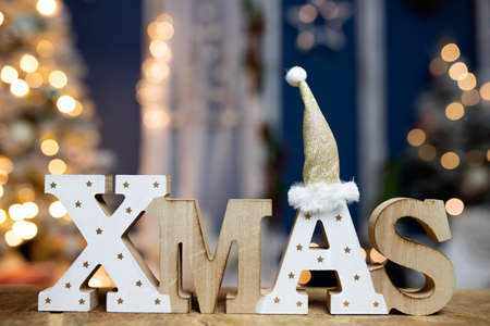 The letters XMAS against sparkling holiday lights and Christmas tree.