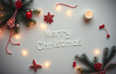 Merry Christmas message top view flat lay, cheerful Xmas holiday atmosphere with decoration arrangement on table