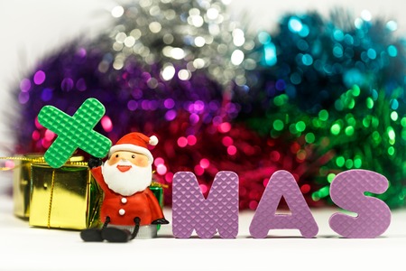 Close up decoration santa claus dolls and christmas gifts isolated on bokeh background