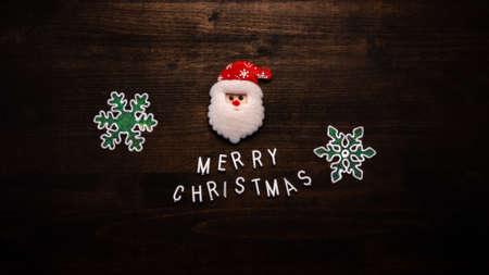 Merry Christmas and Santa Claus flat lay top view on dark wooden table