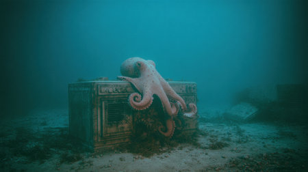 Octopus investigates a sunken research drone in deep water, showing the beauty of marine life in a cinematic light setting.
