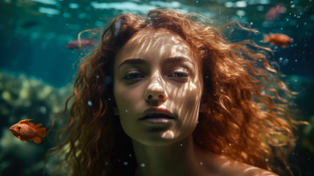 Portrait of a red-haired girl in the water. underwater world.