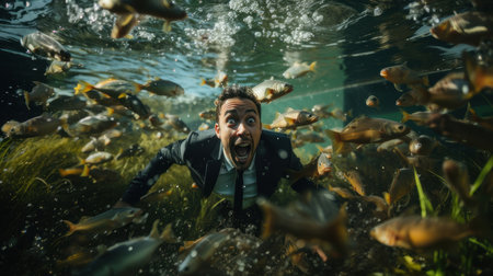 A surprised businessman in a suit underwater surrounded by fish, presenting a unique and creative concept.