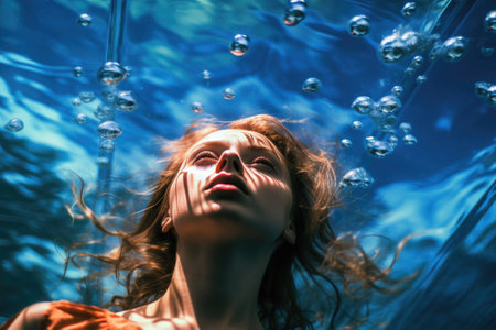 Enveloped in aquatic silence, a woman's portrait beneath the water's surface unveils her elegance and poise, reflecting a harmonious blend with the underwater world