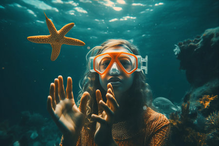 Captivating Aquatic Encounter: A Snorkeling Woman Embracing a Starfish Underwater through a 3:2 Frame