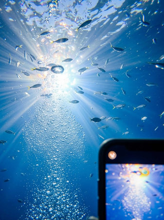 smartphone underwater with sun rays and school of fish in the water