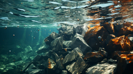 Underwater view of a coral reef with flying gold and silver confetti. Concept of pollution of seas and oceans.