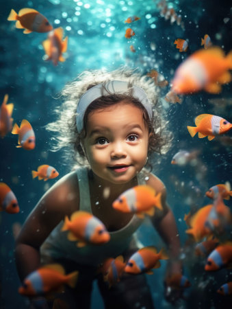 A child joyfully swimming in the crystal blue ocean surrounded by colorful goldfish - Ai generated