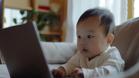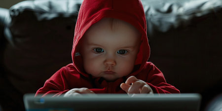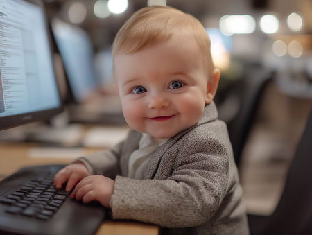 Cute baby boy with blue eyes sitting in front of computer monitor