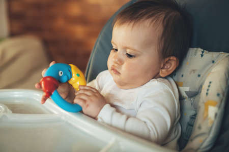 Caucasian newborn baby playing with colorful educational rattle toy while sitting on baby table waiting the meal.