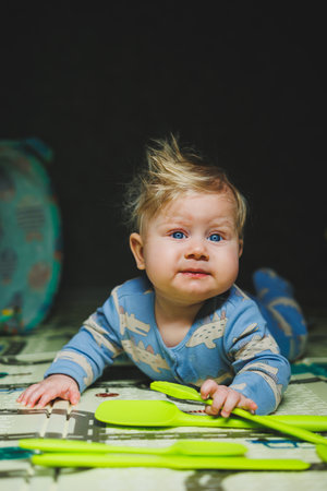 Photo of a 7-9 month old baby at home. A smiling child lies on the floor and plays with toys. Cute boy sitting on the floor.