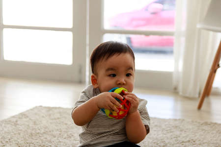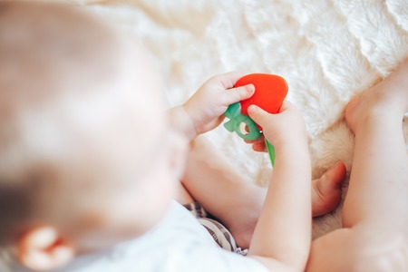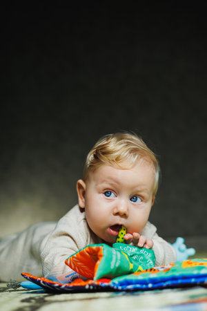 A little boy of 7 months lies on the floor and plays with rubber toys. The baby plays with educational toys.