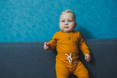 Baby boy in a yellow textile set. Clothes for babies. The child is at home on the couch.