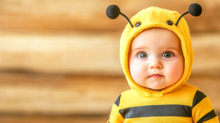 Adorable baby wearing bumblebee costume, portrait on wooden background