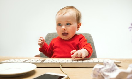 Happy child baby girl toddler sitting with keyboard of computer isolated on a white background