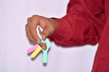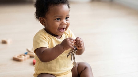 Happy baby playing with metal keys on wooden floor in bright home interior, smiling infant wearing yellow onesie surrounded by toys.