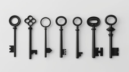 Aesthetic set of 3d different old vintage door keys on white clean background, minimalism concept. Generative AI.
