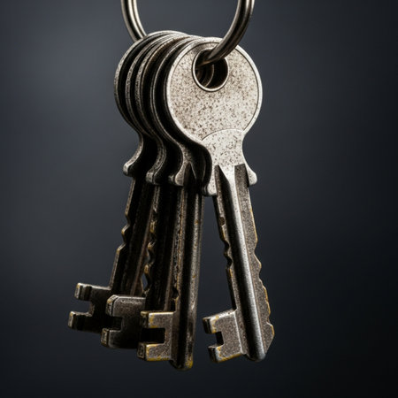 Editorial photograph of vintage metal keys hanging on a ring, presented as a high-contrast silhouett