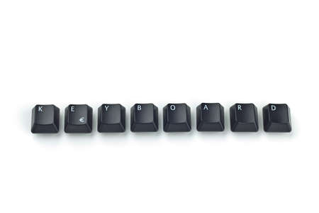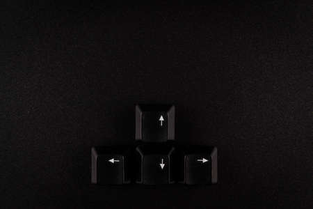 See whats next concept. Flat lay view from above on the table with computer keyboard keys buttons on a dark background.