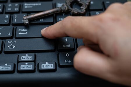Close up female Index finger push button Enter on the computer keyboard, Data protection by key concept