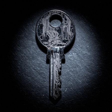 A single, intricate key, etched with the complex pathways of a circuit board, lies illuminated against a dark, textured background.