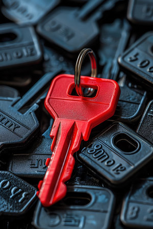A striking image of a glowing red key standing out among many black keys. This visually appealing composition represents concepts of security, mystery, and illumination.