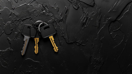 A striking arrangement of three keys attached to sleek black keychains rests on a textured black surface, ideal for themes of security and real estate.