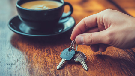 A hand placing keys on a table next to a cup of coffee, symbolizing a busy, modern lifestyle.