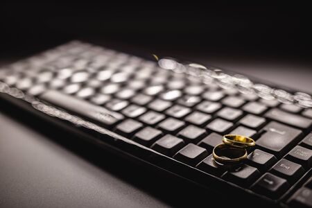 Concept of infidelity or virtual betrayal. Golden wedding rings on a personal computer keyboard.