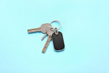 Door key lies on blue background. Set of keys. House key. New house concept. Rental and Selling.