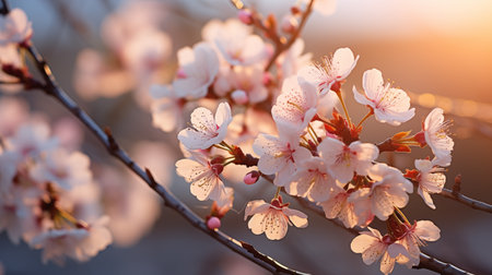 Close-up of spring blooming sakura. A branch of blooming Cherry blossom in the beautiful sunset light.