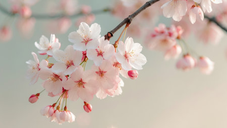 Close-up photo of delicate pink cherry blossoms in full bloom. The petals are soft and velvety, with a gentle, pastel hue. The blossoms create a beautiful display of nature's beauty.